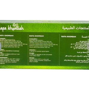 Rafa Khomsah is packed with high antioxidants to help boost your immune system and protect your liver. This powerful supplement contains Black Cumin Extract, Gotu Kola Extract, Temulawak Extract, Guava Leaf Extract, and Red Rice Extract. These ingredients work together to fight off viruses and bacteria, promoting overall health and wellness. Add Rafa Khomsah to your daily routine for enhanced protection and vitality.